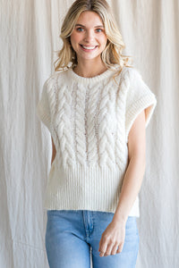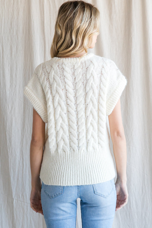 Solid cable knit pullover sweater vest with cap sleeves, and wide rip hems.
