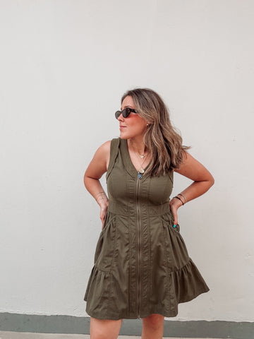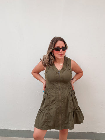 Olive Elastic Zipper Dress - Small