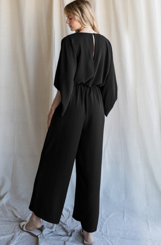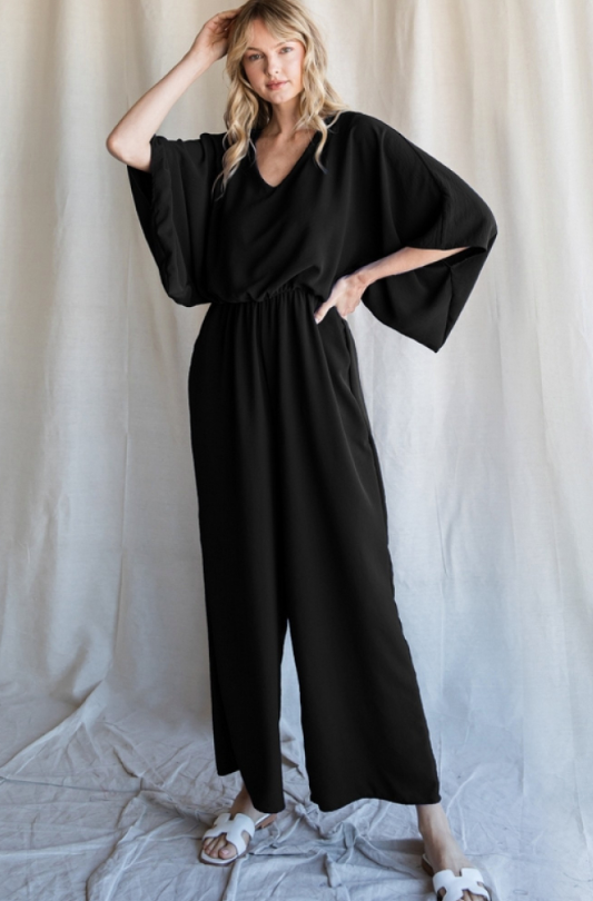 Solid jumpsuit with a V-neckline, wide half sleeves, an elasticized waistline, and straight leg.- Unlined, non-sheer, lightweight.- Fab wears a Small.