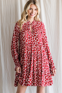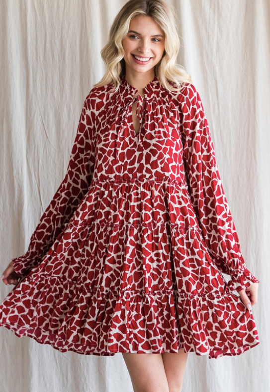 Print dress with a frill mock neck and self-tie neckline, long bubble sleeves with smocked cuffs, and tiered skirt