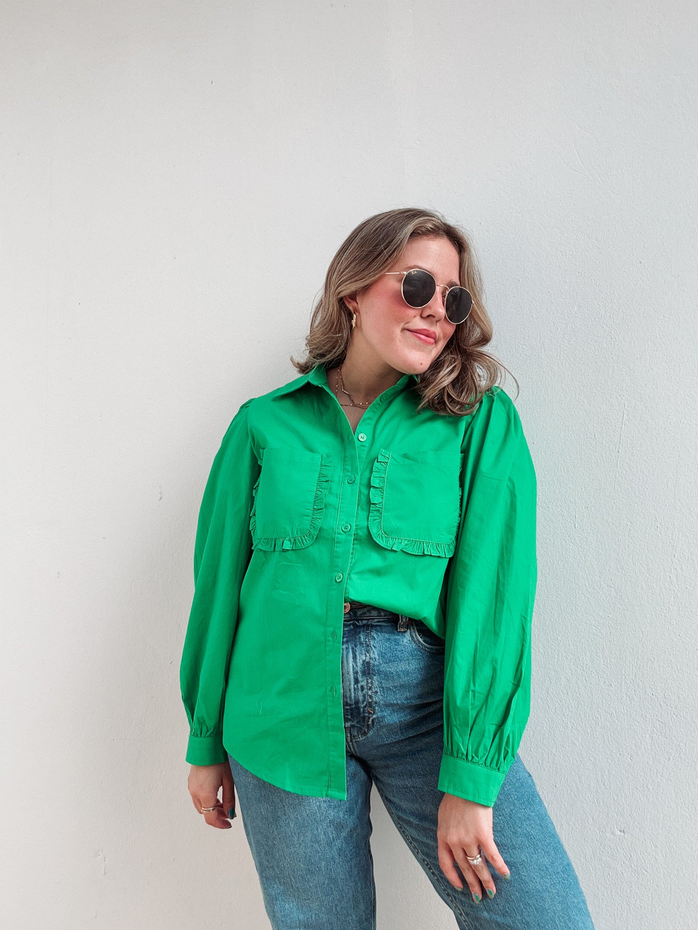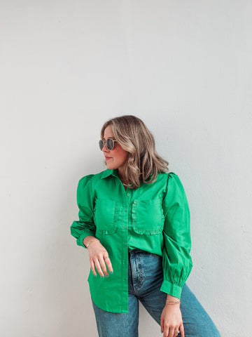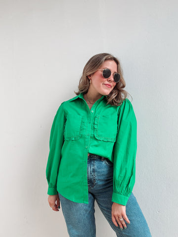 Inform when this item available: Gardenia Green Ruffle Pockets Button Down