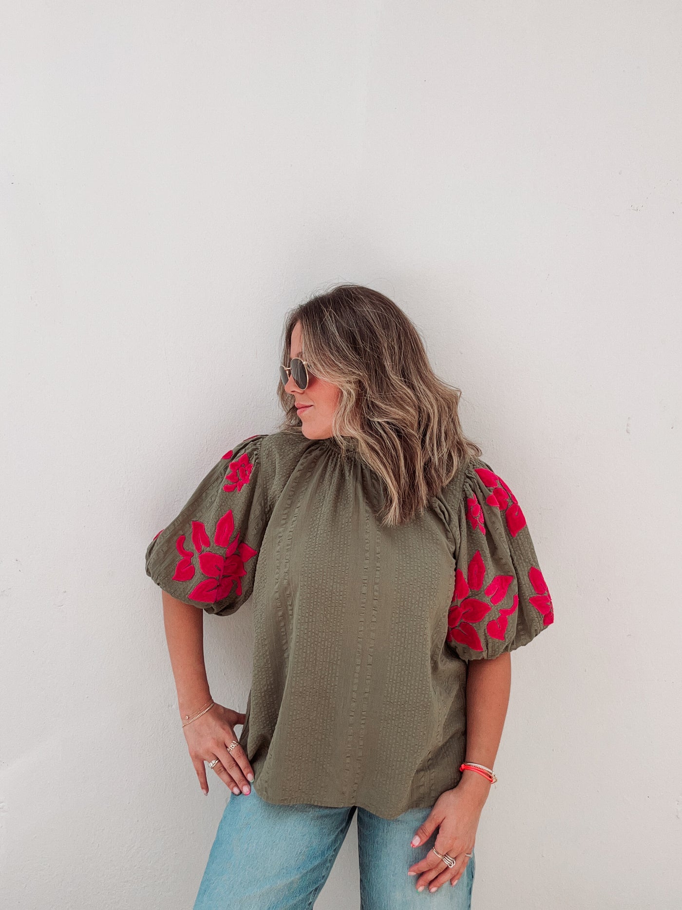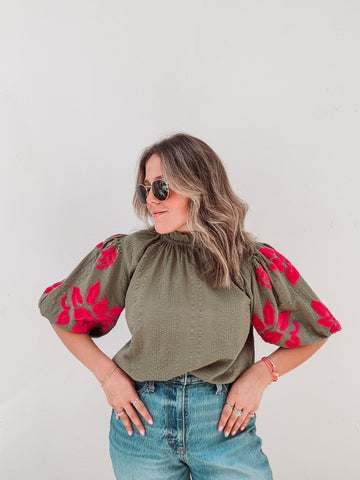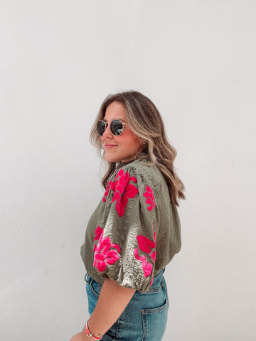 Inform when this item available: Olive & Hot Pink Velvet Floral Blouse