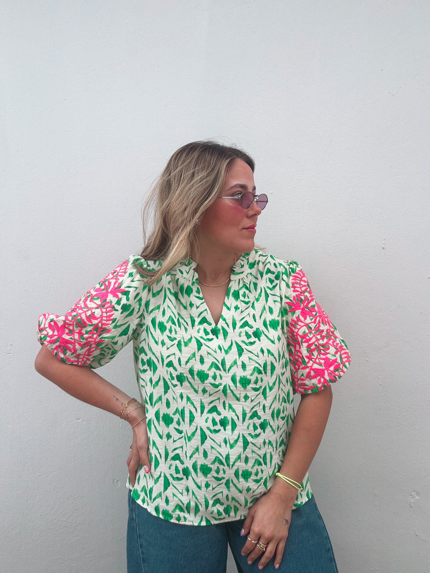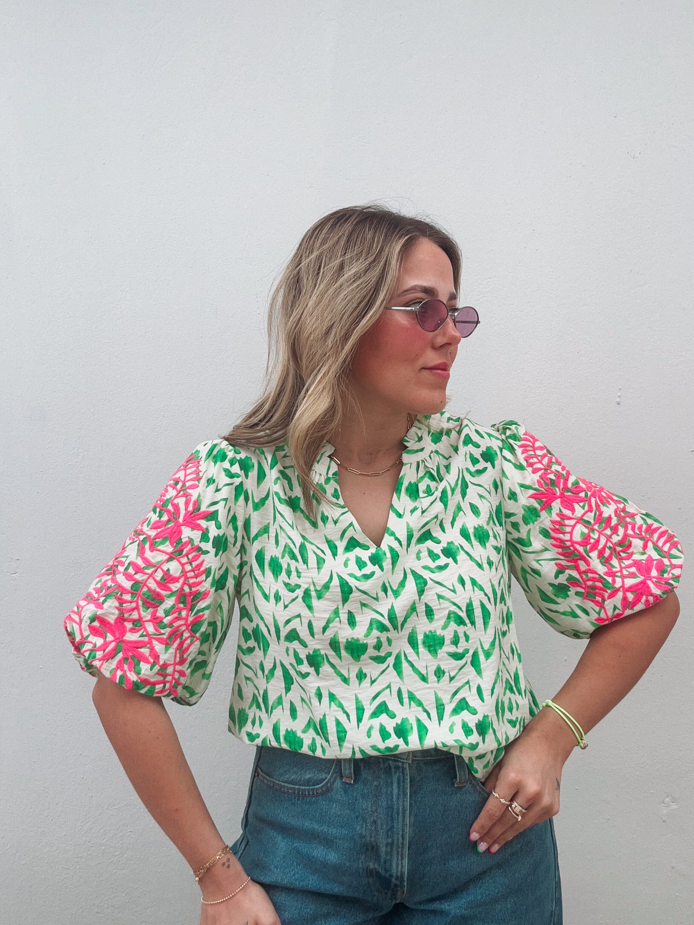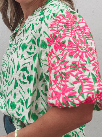 Inform when this item available: Flower White & Green Embroidered Hot Pink Blouse