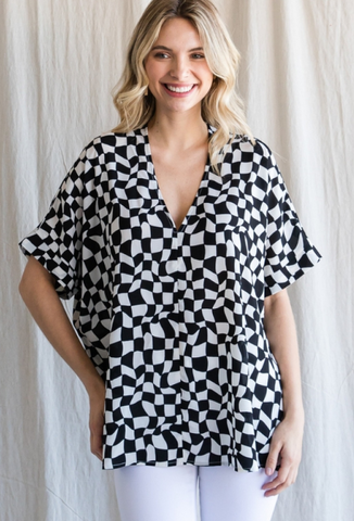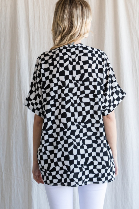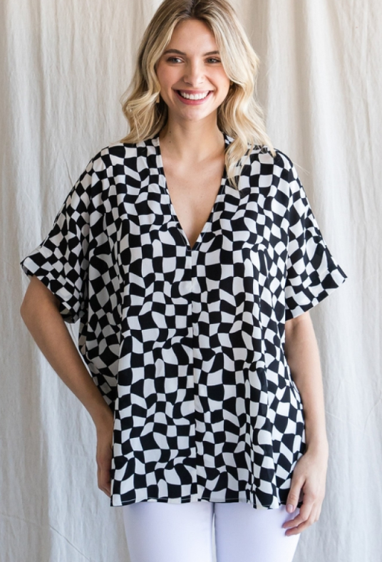 Checkered boxy top with a V-neckline and short dolman sleeves.- Unlined, non-sheer, lightweight.