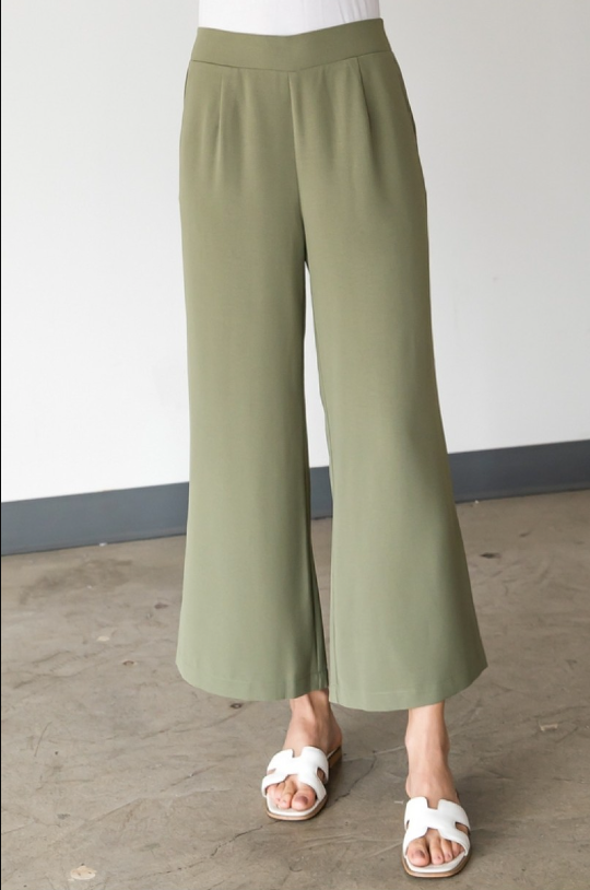 Solid pants with a high waistline, side pockets, and wide flared legs.