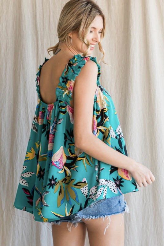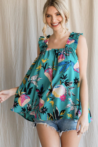 Floral print tank top with ruffle shoulder straps. Unlined, non-sheer, lightweight.